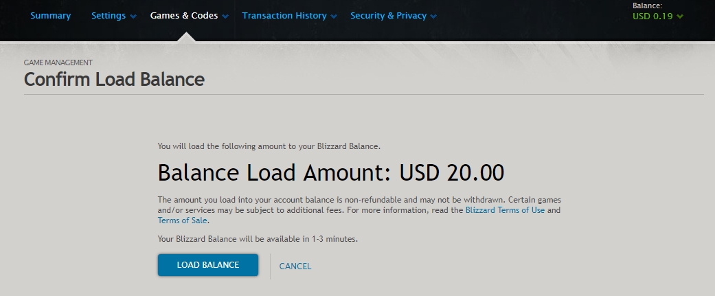 Truy cập https://us.battle.net/account/management/claim-code.html nhập Code và ấn REDEEM CODE Sẽ hiện ra 1 thông báo Confirm như hình dưới, bấm LOAD BALANCE là OK